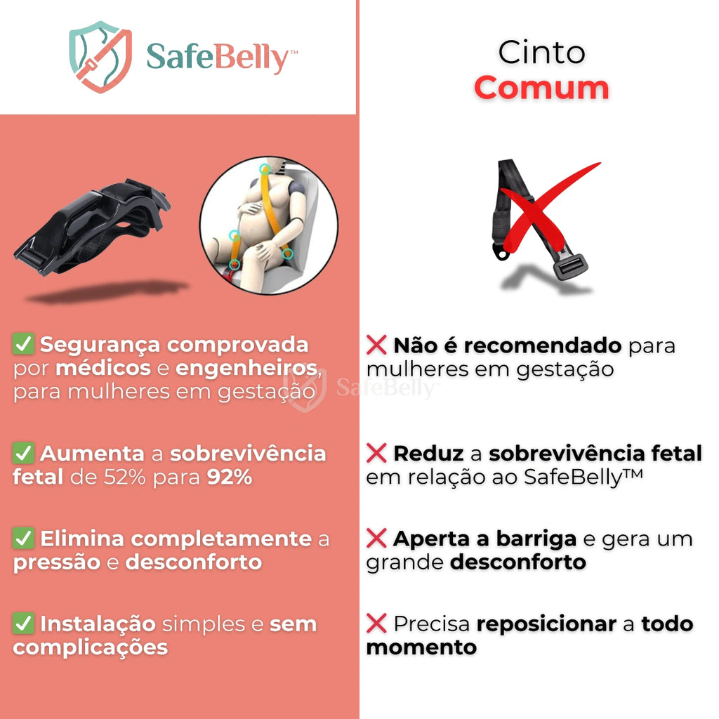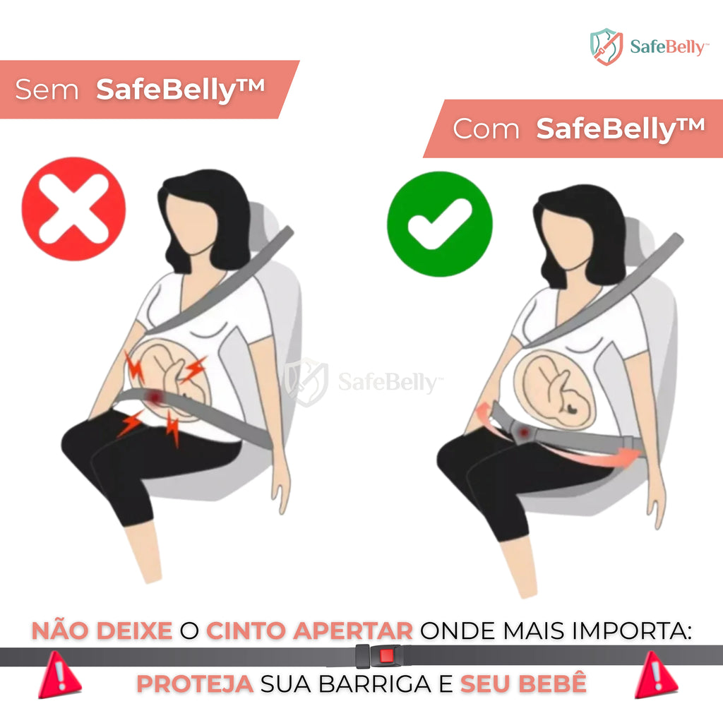 O cinto comum pressiona a barriga e te faz mal durante a gravidez, já o SafeBelly™ reposiciona a faixa para te proteger e trazer conforto durante todo o seu percurso.