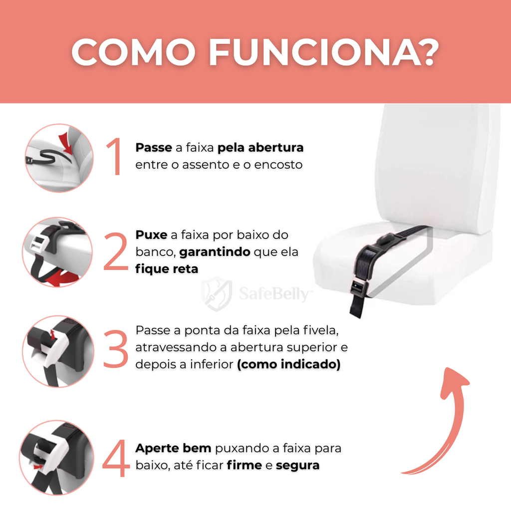 No carro, basta um freio forte ou um solavanco para o cinto comum apertar exatamente onde não deveria: na barriga. O SafeBelly™ ajusta o cinto para que a força fique distribuída na região correta, reduzindo a pressão direta no ventre e deixando você mais tranquila em qualquer trajeto.